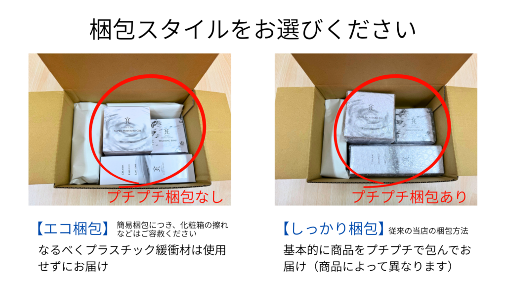 ご注文時に、「エコ梱包」もしくは「しっかり梱包」をお客様ご自身でご選択いただけるようにしましたので、お好みの梱包スタイルをお選びいただけますと幸いです。