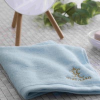 可愛いながらも綺麗な水色のタオルに金色のロゴマークの刺繍が素敵です。生地もふわふわで、押さえただけで水分をしっかりと吸収してくれて使用感も最高です。大きさもちょうどいいです。